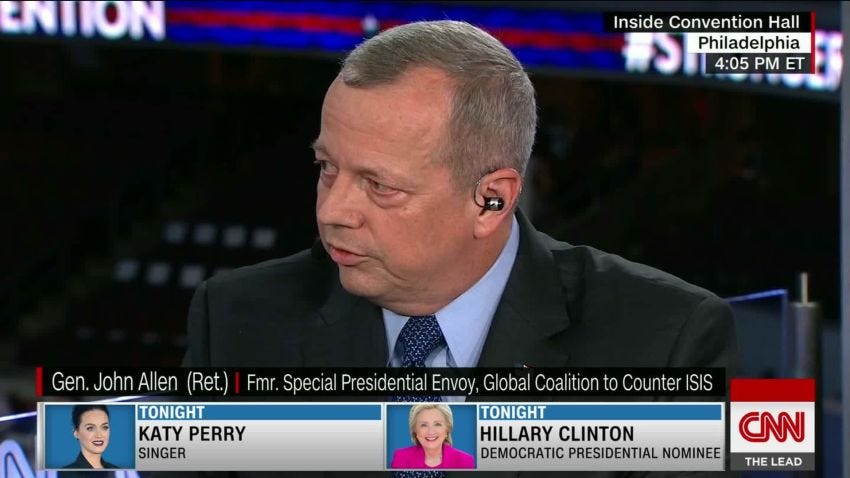Now I have retired Army guys writing me on Substack to offer encouragement as we watch the Marine Corps wither on the vine due to colossal mismanagement enabled by the Great Awokening. How did this happen? How did my Marine Corps mentor, General John R Allen, go from despising Bill Clinton to endorsing Hillary Clinton on National TV during a democratic convention? He was one of many who patiently explained that it was our sacrosanct duty to follow the duly elected President, but that noble sentiment went MIA when President Trump won his first term.